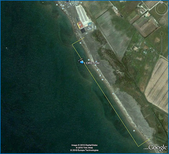 Facendo seguito al primo Spot i, quello che vediamo nell'immaggine è la zona di pesca nominata "I Cretoni", questo spot è molto frequentato dai locali per le sue catture e come si puo vedere , di fronte al litorale ci sono zone rocciose dove il pesce trova rifuggio. I fondali sono medio bassi degradanti e sabbiosi misti a roccia coralligena e cretone. Per raggiunge la località prenderemo la stessa strada descritta nel precedente spot, ma una volta raggiunta la stada fronte mare, questa volta si svoltera a sinistra, fino a raggiungere lo stabilimento ZELIO BEACH, qui troveremo un'ampio parcheggio, una volta scaricata l'attrezzatura si raggiunge la spiaggia e ci si incamminera sempre sulla sinistra sino ad arrivare sulla zona di pesca.